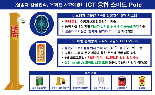 한마디로 우회전사고예방, 치매노인 알림, 범죄자 얼굴인식 알림, 영상자체저장기능을 가진 ICT 융합 스마트 횡단보도 Pole(철주)제작 전문업체다. 아이를 키우는 부모로서 교통사고, 실종사고, 범죄노출의 3가지 문제점을 신호등 철주에서 해결이 가능하다고 생각했고 첨단기능들을 모아 ICT융합 스마트 Pole(철주)사업을 하게 됐다.