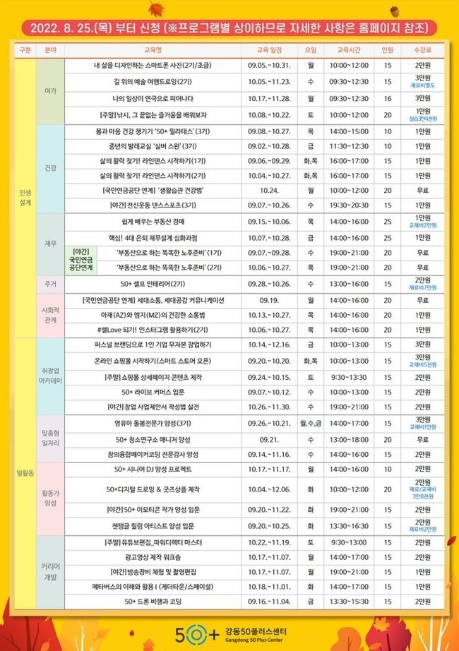 9~10월 프로그램은 8월 18일(목), 8월 25일(목) 순차적으로 신청을 받으며 프로그램별 신청 날짜가 상이하므로, 자세한 사항은 강동50플러스센터 홈페이지를 확인하거나 강동50플러스센터로 문의하면 안내 받을 수 있다.