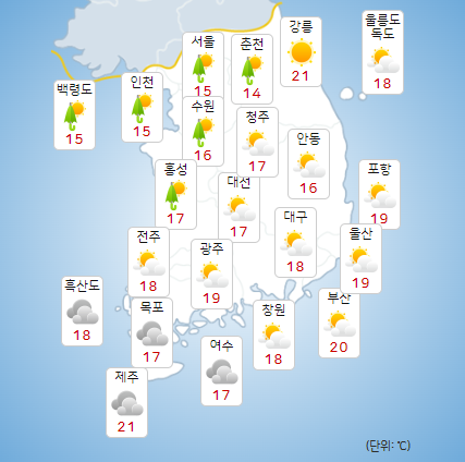 예상 최고기온은 서울 15도, 인천 15도, 춘천 14도, 강릉 21도, 대전 17도, 대구 18도, 전주 18도, 광주 19도, 부산 20도, 제주 21도 등이다.