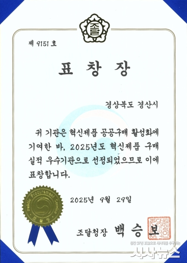 [시사뉴스 장시목 기자]경산시(시장 조현일)가 혁신 제품 구매 실적 성과를 인정받아 조달청으로부터 우수기관 표창을 수상했다고 밝혔다.