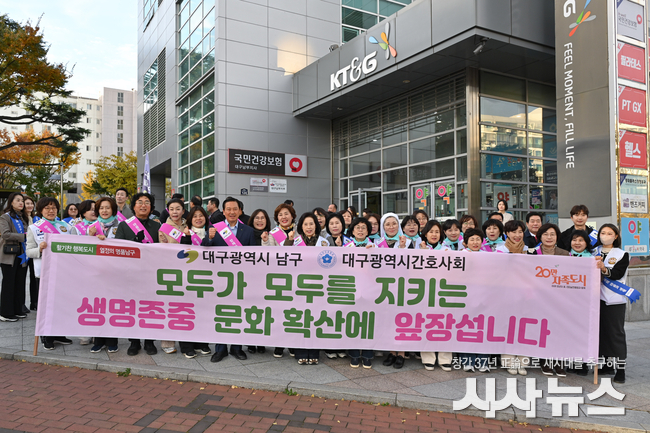 [시사뉴스 장시목 기자]대구 남구(구청장 조재구)는 11월 11일 남구 주요 네거리를 중심으로 지역사회 자살예방 및 생명존중 문화를 확산하기 위해 14개 보건의약단체 및 주민단체가 합동으로 대대적인 캠페인을 펼쳤다고 밝혔다.