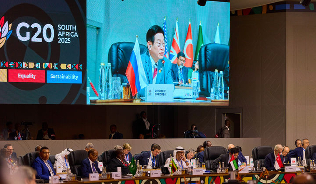 이재명 대통령은 22일 남아프리카공화국 나스렉 엑스포센터에서 열린 G20 정상회의 제1세션에서 '누구도 소외되지 않은 포용적 지속 가능한 성장'이라는 주제로 논의했다.