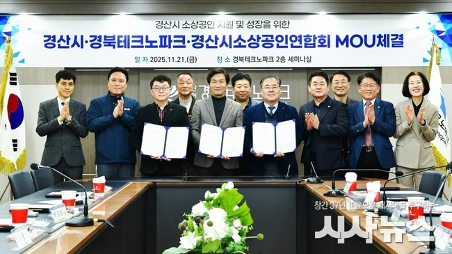 [시사뉴스 장시목 기자]경산시(시장 조현일)는 21일 경북테크노파크 세미나실에서 경북테크노파크, 경산시소상공인연합회와 함께 ‘소상공인 성장 지원 업무협약(MOU)’을 체결했다고 밝혔다.