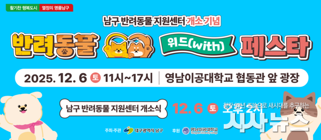 [시사뉴스 장시목 기자]대구 남구(구청장 조재구)는 오는 12월 6일 토요일, 오전 11시부터 오후 5시까지 영남이공대학교 내 협동관 앞 광장에서 ‘대구 남구 반려동물 위드(with) 페스타’를 개최하고, 이 자리에서 대구 최초로 설립한 ‘남구반려동물지원센터’ 개소식을 함께 진행한다고 밝혔다.