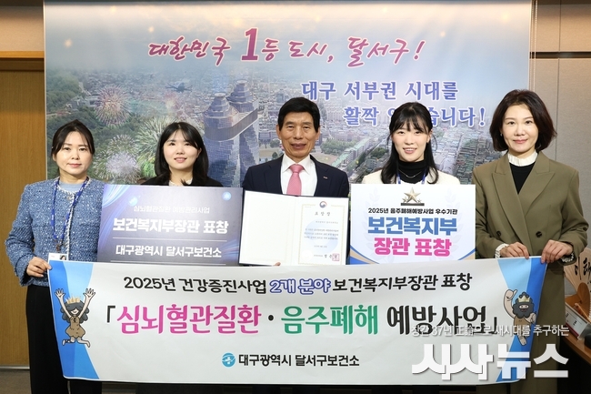 [시사뉴스 장시목 기자]대구 달서구(구청장 이태훈)보건소가 음주폐해예방사업 우수사례 기관 표창과 심뇌혈관질환 예방관리 유공기관 표창에서 각각 보건복지부 장관상을 수상하며, 2개 부문 동시 수상이라는 성과를 거뒀다.