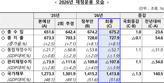 이날 국회를 통과한 2026년도 예산안에 대한 수정안에 따르면 총수입은 정부안 674.2조원에서 675.2조원으로 1조원 늘었다.