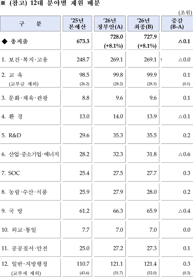 총지출은 정부안 728조원에서 727.9조원으로 0.1조원 감소했다.