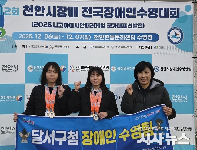 [시사뉴스 장시목 기자]대구 달서구(구청장 이태훈) 장애인 수영팀이 12월 6일부터 7일까지 충남 천안에서 열린 「제2회 천안시장배 전국장애인수영대회」에서 금메달 2개와 은메달 2개를 획득하며 뛰어난 성과를 거뒀다.