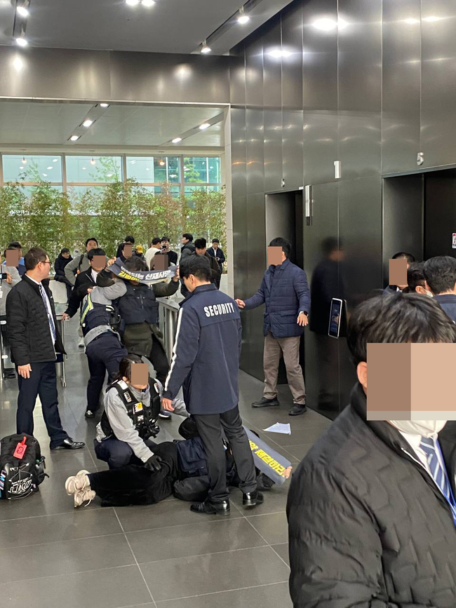 이들은 이날 쿠팡 본사에서 '물류센터 산재사망 쿠팡이 책임져라', '개인정보 유출 김범석이 책임져라' 등의 문구가 적힌 펼침막을 내걸고 김범석 쿠팡Inc 이사회 의장과의 면담을 요구하며 김 의장 사무실로 가려다 경찰에 체포됐다.