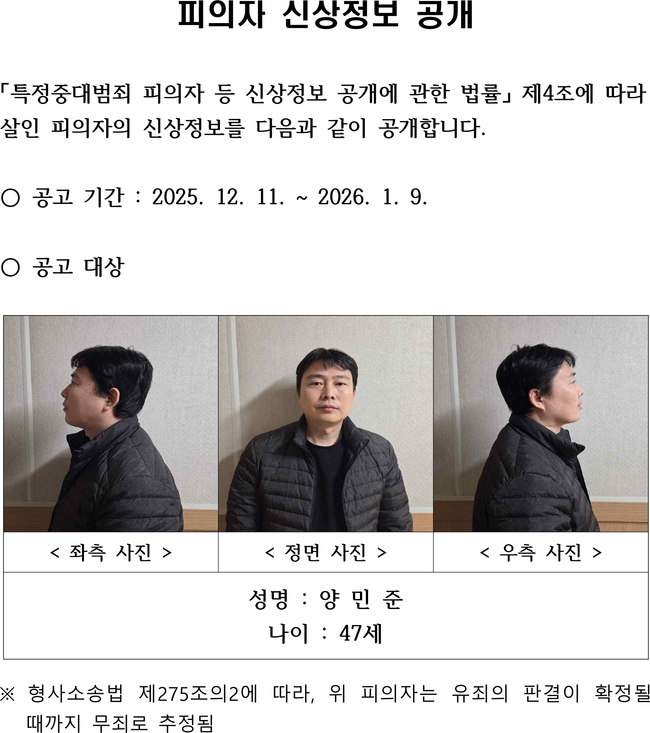충청남도경찰청은 11일 신상정보공개심의위원회를 개최해 양민준의 신상정보롤 홈페이지를 통해 2025년 12월 11일∼2026년 1월 9일 공개하기로 결정했다.