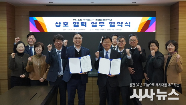[시사뉴스 장시목 기자]계명문화대학교(총장 박승호)와 푸디스트 주식회사는 최근 동산관 대회의실에서 급식산업 발전 및 전문 인력 양성을 위해 업무협약(MOU)을 체결했다.