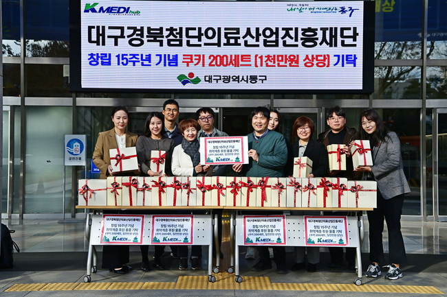[시사뉴스 이성동 기자] 대구경북첨단의료산업진흥재단(이사장 박구선)은 창립 15주년을 맞아 지난 12일, 지역 내 어려움을 겪는 동구 저소득 가정을 위해 쿠키 200상자(1천만원 상당)를 동구청에 기탁했다.