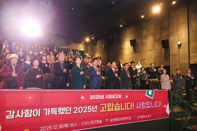 [시사뉴스 이성동 기자] 대구 중구(구청장 류규하)는 남산종합사회복지관(관장 윤보경) 주관으로 지난 지난 18일 CGV대구한일에서 후원자와 자원봉사자, 지역주민 등 100여 명이 참석한 가운데 2025년 한 해 동안의 사업과 성과를 공유하는 사업보고회를 개최했다.