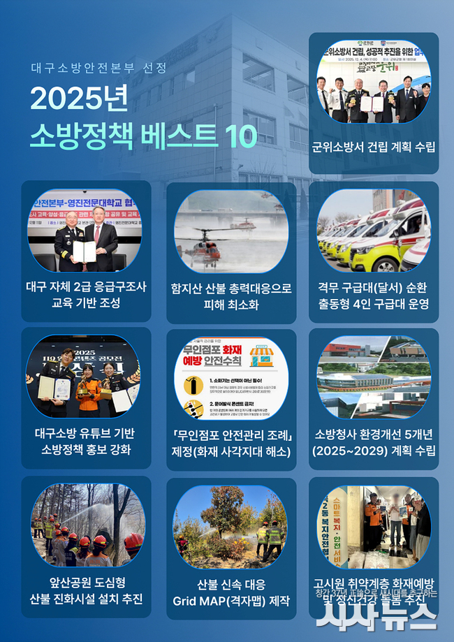 [시사뉴스 하정수 기자] 대구소방안전본부는 2025년 한 해 동안 추진한 주요 소방정책 가운데 현장 대응력 강화와 시민 안전 증진에 기여한 ‘2025 대구소방 소방정책 베스트 10’을 선정해 발표했다.