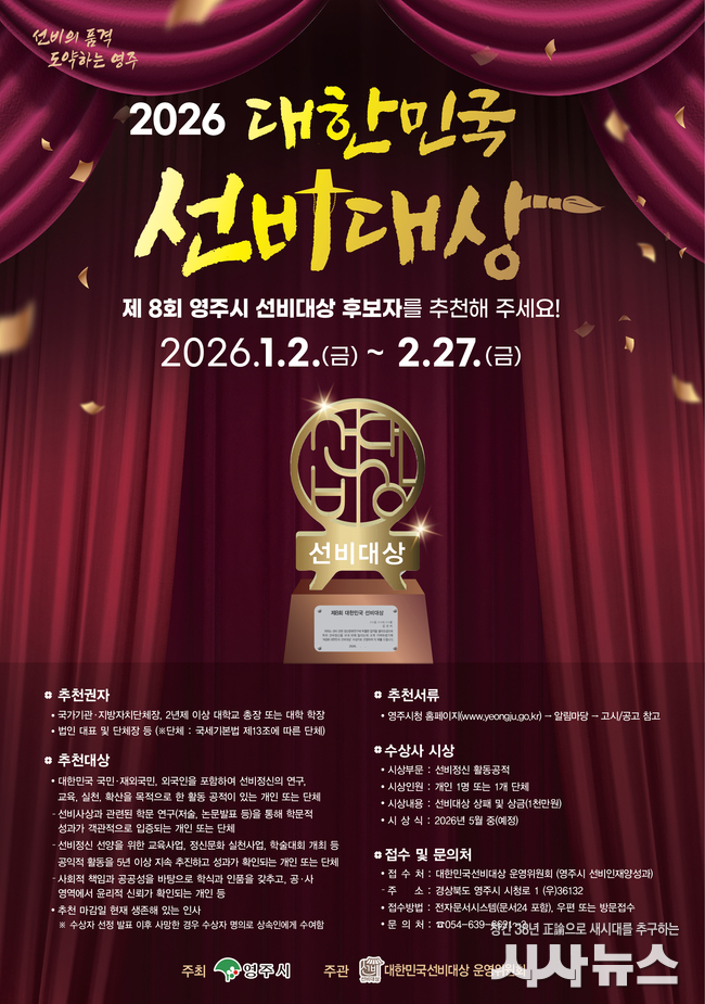 시상식은 5월 개최 예정인 2026영주 한국선비문화축제 기간 중 열리며, 수상자에게는 상패와 함께 상금 1,000만 원이 수여된다.