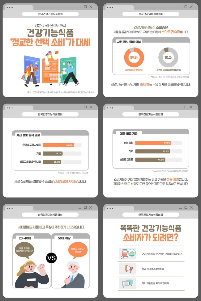 건기식협회 관계자는 “소비자들이 건강기능식품 구매 전 성분 함량과 가격, 정보 출처 등을 꼼꼼히 확인하는 경향이 뚜렷해지고 있다”며, “필요에 맞는 제품을 정확히 이해하고 합리적으로 선택할 수 있도록 관련 정보를 지속적으로 제공하겠다”고 말했다.