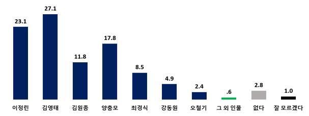 꼭 투표층의 남원시장 적합도 역시 김영태 27.8%, 이정린 23.4% , 양충모 17.7%, 김원종 11.8%, 최경식 8.3%, 강동원 5.2%, 오철기 2.3% 순으로 전체 흐름과 비슷하다.