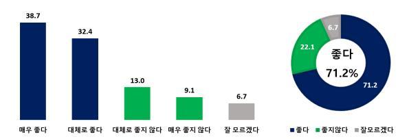 당 지지층별로 보면 더불어민주당 지지층에서는 74.1%가 긍정적인 반응을 보였고 조국혁신당 지지층에서는 80.1%가 좋게 보는 것으로 나타났다.