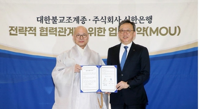 [시사뉴스 홍경의 기자] 신한은행은 11일 대한불교조계종과 서울 종로구 소재 한국불교역사문화기념관에서 '전략적 협업 및 파트너십 강화를 위한 업무협약'을 체결했다고 밝혔다.