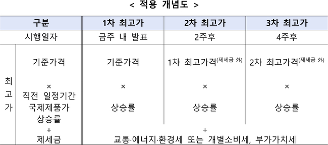 최고가격 조정 시에는 ‘제세금을 제외한 1차 최고가격’을 기준가격으로 해 ‘직전 일정기간 국제제품가 상승률’을 곱한 값에 제세금을 가산한다. 국제석유제품 가격 상승률은 한국석유공사 페트로넷에 게시된 가격지표를 활용한다.