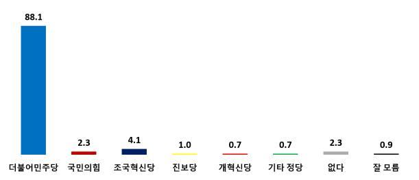 정당지지도는 ‘더불어민주당’이 88.1%로 압도적인 가운데 ‘조국혁신당’ 4.1%, ‘국민의힘’ 2.3%, ‘진보당’ 1.0% 순임. ‘개혁신당’ 0.7%, ‘기타 정당’ 0.7%, ‘지지정당 없다’는 2.3%로 나타났고 잘 모름은 0.9%였다.