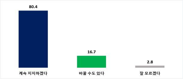 지지 의향에 대해서는 ‘지금 지지하는 후보를 계속 지지’ 80.4%, ‘바꿀 수도 있다’ 16.7%, ‘잘 모름’ 2.8%였다.