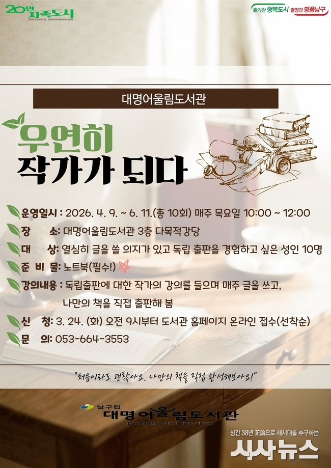 [시사뉴스 장시목 기자]대구 남구(구청장 조재구)는 지역주민에게 직접 도서를 출판해 보는 경험을 제공하고자 도서 독립출판 프로그램 「우연히 작가가 되다」를 운영한다고 밝혔다.