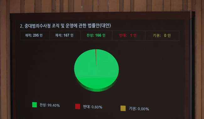 국회는 21일 본회의를 개최해 중대범죄수사청 조직 및 운영에 관한 법률안을 여권 주도로 총 투표수 167표 가운데 찬성 166표, 반대 1표로 통과시켰다.