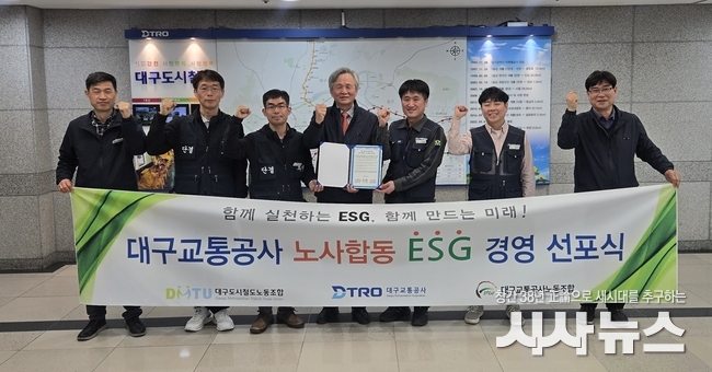 [시사뉴스 하정수 기자] 대구교통공사는 지난 3월 27일(금) 노사 대표가 참여한 가운데 ‘노사합동 ESG 경영 실천 선언문’ 서명식을 열고 ESG 경영을 공동 추진하기로 했다.