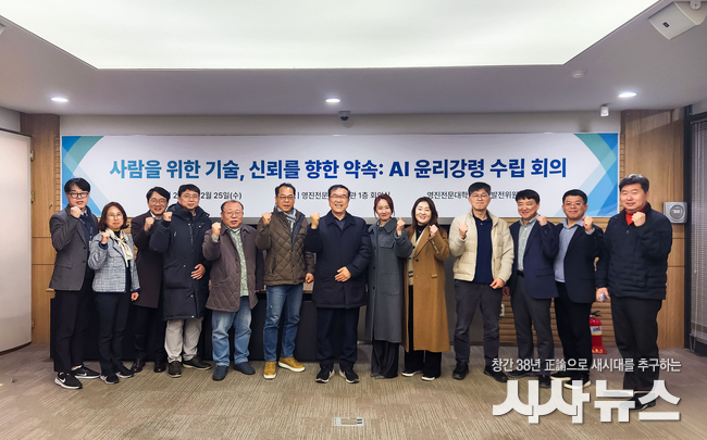 ※ 사진은 ‘영진전문대학교 AI 윤리강령’ 수립을 위한 회의 참석자들이 기념촬영을 하고 있는 모습.