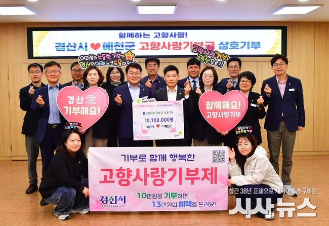 이번 상호 기부는 경산시 기획조정국과 행정지원국 소속 직원 107명, 예천군 직원 107명이 참여해 각각 1,070만 원을 기부했으며, 이를 계기로 고향사랑기부제에 대한 관심을 높이고 지역 간 교류와 상생협력을 더욱 확대해 나갈 계획이다.