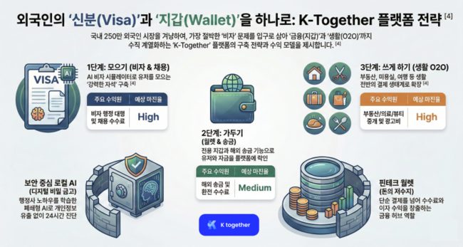 저희는 이달 중 K-Together 앱 출시를 목표로 준비하고 있습니다. 초기에는 AI 기반 비자 상담 및 정보 안내 기능을 중심으로 시작하되, 이후에는 외국인의 실제 생활과 밀접한 해외송금, 월렛, 결제 등 금융 기능, 그리고 취업, 부동산, 의료, 생활편의 서비스까지 범위를 점차 넓혀갈 계획입니다.