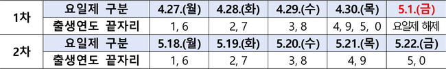 온·오프라인 모두 신청 첫 주에는 혼잡 및 시스템 과부하를 막기 위해 출생 연도 끝자리를 기준으로 요일제가 적용된다.