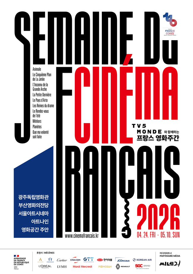 2026년 4월 24일(금)부터 5월 3일(일)까지 진행되는 ‘제5회 프랑스 영화주간 ’은 중구 정동길 3 경향아트힐 2층(경향신문사) 시네마테크 서울아트시네마에서 진행된다. 관람료는 일반 9,000원이며 자세한 일정과 상영작에 대한 정보는 서울아트시네마 홈페이지에서 확인할 수 있다.