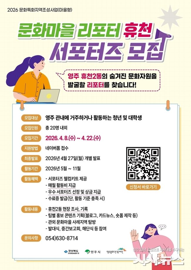 [시사뉴스 장시목 기자](재)영주문화관광재단(이하 재단)은 2026년 문화특화지역조성사업(마을형)의 일환으로 청년 참여형 기록·홍보 프로젝트인 「문화마을리포터 : 휴천」 서포터즈를 모집한다.
