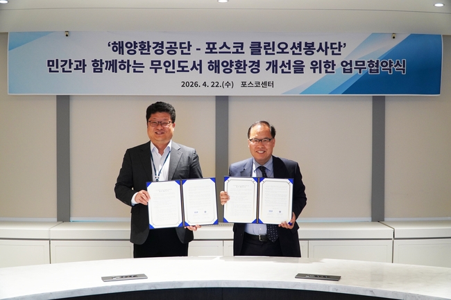 [시사뉴스 이광효 기자] 해양환경공단(이사장 강용석)은 22일 서울특별시 강남구에 있는 포스코센터에서 포스코 클린오션봉사단(단장 민은성)과 ‘민간과 함께하는 무인도서 해양환경 개선을 위한 업무협약’을 체결했다.