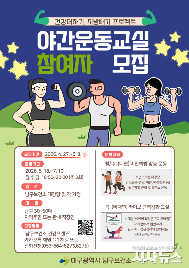 [시사뉴스 장시목 기자]대구 남구(구청장 조재구)는 오는 5월부터 관내 직장인과 주민의 비만 예방 및 신체활동 활성화를 위한 ‘건강 더하기 지방빼기 프로젝트! 2026년 야간운동교실’을 운영한다고 밝혔다.