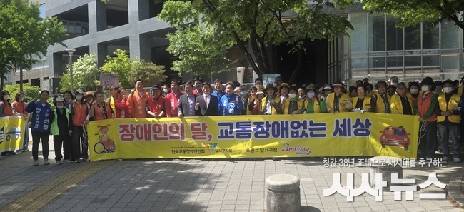 [시사뉴스 장시목 기자]사단법인 한국교통장애인협회 대구 달서구지회는 2026년 4월 24일 오후 3시, 대구 도시철도 2호선 산업단지역 사거리 일대에서 ‘교통사고 30% 줄이기’를 목표로 한 교통안전 캠페인을 개최했다.