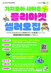 [시사뉴스 장시목 기자]청도우리정신문화재단은 오는 11월 1~2일(토·일) 양일간, 청도 새마을운동발상지기념공원 일원에서 개최되는 ‘2025 가치모아 새마을 플리마켓’의 셀러(판매자) 참가자를 모집한다고 밝혔다. ‘가치모아 새마을 플리마켓’은 청도군민이 주체가 되어 직접 참여하고, 나눔과 소통을 실천하는 플리마켓 행사로, 지속 가능한 소비문화 확산과 새마을정신 실천을 담고 있다. 플리마켓 외에도 버스킹공연, 마술쇼, 풍선아트, 레크리에이션 등 다양한 문화프로그램이 함께 운영될 예정이다. 현장을 방문하는 관람객들을 위한 스탬프 투어 이벤트도 준비되어 있으며, 스탬프투어 완료 시 친환경 새마을 에코백이 증정된다. 한편, 이번 행사의 핵심은 주민 셀러와 지역 업체의 직접 참여다. 모집대상은 청도군에 거주하는 가족 또는 개인셀러 30팀, 청도군소재 업체 10팀이며, 모집 분야는 핸드메이드 공예품, 중고물품, 농산물품, 가공식품, 체험프로그램 등이다. 참가신청은 홍보 포스터에 안내된 정보무늬(QR)코드를 통해 신청서를 작성해 제출하면 된다. 행사를 기획한 청도우리정신문화재단 관계자는 “플리마켓을 통해 주민과 업체가 함께 지역 가치를 나누고, 이웃과 소통하는 따뜻한 만