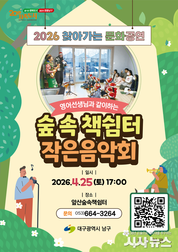[시사뉴스 장시목 기자]대구 남구(구청장 조재구)는 지역 주민들에게 일상 속 문화 향유기회를 확대하고, 지역 예술가들의 공연 활동을 지원하기 위해 ‘2026 찾아가는 문화공연’을 개최한다고 밝혔다. 이번 공연은 오는 4월 25일(토) 오후 5시 앞산 숲속 책쉼터에서 진행되며, 책쉼터를 찾는 어린이와 가족 단위 방문객들에게 책 읽어주기 체험과 함께 특별한 문화예술 경험을 선사할 예정이다. 공연은 ‘영어선생님과 같이하는’이라는 주제로, 어린이와 가족이 함께 어울릴 수 있는 작은 음악회 형식으로 진행된다. 원어민 영어선생님과 함께 책도 읽고, 노래도 부르는 형식으로 숲속 책쉼터의 특성을 살린 문화공연이 될 예정이다. 조재구 남구청장은 “앞산 숲속 책쉼터는 가족 단위 방문객이 자연 속에서 쉽게 찾을 수 있는 작은 문화공간으로 주민들이 일상에서 소소한 행복을 느끼며 힐링할 수 있기를 바란다.”라며, “대규모 축제나 행사도 중요하지만, 주민들이 사는 가까운 동네에서 편하게 문화예술을 접할 수 있도록 찾아가는 문화행정을 적극 추진하겠다.”라고 전했다. ‘2026 찾아가는 문화공연’에 대한 자세한 문의는 대구 남구 문화관광과 문화콘텐츠팀(053-664-3264)으로 연락하