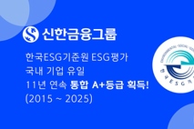 [시사뉴스 홍경의 기자] 신한금융그룹은 한국ESG기준원이 발표한 ‘2025년 KCGS ESG 평가 및 등급 공표’에서 2015년부터 국내 기업 최초로 11년 연속 통합 A+ 등급을 획득했다고 19일 밝혔다. 한국ESG기준원은 매년 국내 상장기업의 지속 가능한 성장을 독려하기 위해 ▲환경 ▲사회책임 ▲기업지배구조 부문을 평가해 ESG 등급을 공표하고 있다. 올해 평가 결과, 신한금융은 국내 기업 중 유일하게 11년 연속 ESG 통합등급 A+ 평가를 받았다. 신한금융은 지속 가능한 성장을 위해 국내 금융사 최초로 전환금융 정책을 수립하고, 한국형 녹색분류체계 기반 여신 시스템 고도화 등 탄소 감축을 위한 실질적인 실행에 앞장서고 있다. 또한 청년 일자리 창출, 저출산 해소를 위한 육아 나눔터 조성 등 사회문제 해결을 위한 다양한 사업 추진과 함께 ESG 활동으로 창출된 사회적 가치 측정 ·관리 분야를 더욱 넓혀가는 등 금융을 넘어 사회 전반에 긍정적 변화를 이끌고 있다. 신한금융 관계자는 "신한금융은 금융의 선한 영향력을 통해 고객과 지역사회가 함께 성장할 수 있는 지속가능한 미래를 위해 모든 임직원이 노력하고 있다” 며,““앞으로도 신한금융은 기후변화 대응과