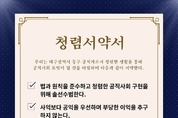 [시사뉴스 이성동 기자] 대구 동구청은 청렴 문화 확산과 공직기강 확립을 위해 청렴한 생활을 통해 모범이 될 것을 다짐하는 ‘청렴서약서’를 제작해 구청 부서 및 동행정복지센터 출입구에 부착했다. ○ 서약서에는 △법과 원칙 준수 △공익 우선 △금품·향응 수수 금지 △공정하고 객관적인 직무 수행 등의 내용이 담겼다. ○ 김태운 동구청장 권한대행은 “청렴은 선택이 아닌 공직자가 갖춰야 할 가장 중요한 가치”라며 “전 직원이 책임감을 느끼고 구민들에게 신뢰받는 투명한 행정을 펼쳐 나가겠다”고 말했다.