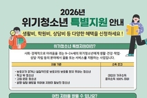 [시사뉴스 장시목 기자]청도군은 경제적 어려움, 학업 중단, 가정 문제 등으로 위기 상황에 놓인 청소년을 돕기 위해 [2026년 상반기 청도군 위기청소년 특별지원사업 집중 신청기간]을 지난 4월 8일부터 오는 5월 7일까지 운영한다. 이 사업은 위기 상황에 놓인 청소년들에게 생활비, 학업지원비, 의료비, 심리상담비, 자립지원비 등 맞춤형 지원을 제공해 안정적인 생활을 돕고, 청소년들이 건강하게 성장할 수 있도록 지원하는 것을 목표로 한다. 지원 대상은 9세 이상부터 24세 이하 청소년(기준 중위소득 100%이하 가구)으로, ▲ 교육적 선도 대상자 중 비행ㆍ일탈 예방을 위하여 지원이 필요한 청소년, ▲ 학교 밖 청소년, ▲보호자가 없거나 실질적으로 보호자의 보호를 받지 못하는 청소년, ▲고립·은둔 청소년이다. 신청은 주소지 관할 읍면사무소에서 가능하며, 청소년 본인뿐 아니라 보호자, 교사, 청소년지도사(상담사 포함), 사회복지사 등 제3자를 통한 대리 신청도 가능하다. 최종 선정은 소득·재산 등을 조사한 후, 청도군청소년복지심의위원회에서 심의를 통해 결정되며, 선정된 대상자는 오는 5월부터 7월까지 생활비, 학업비, 의료비 등을 지원받을 수 있다. 이나경 행정