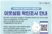 [시사뉴스 이성동 기자] 대구 중구는 고독·고립 예방을 위해 ‘이웃살핌 확인조사’를 실시한다. 이번 조사는 한부모가족, 차상위계층, ‘25년도 긴급복지지원 대상, 쪽방거주자 및 2023년~2025년 1인가구 조사대상자 중 부재로 인한 미조사 가구를 대상으로 사회적 고립 위험군을 발굴하고 지원하기 위해 추진된다. 조사는 4월부터 10월까지 7개월간 진행되며, 12개동 행정복지센터 맞춤형복지팀과 종합사회복지관이 협력해 추진한다. 여기에 즐거운생활지원단(어르신일자리), 동지역사회보장협의체, 복지통장 등이 참여해 전화, 가정방문, QR코드 스캔을 활용한 온라인 조사 등 다양한 방식을 병행해 실시한다. 조사항목은 기본 인적사항, 사회적 고립도, 가구 취약성(경제,신체,정서) 등이다. 앞서 중구는 2023년에는 장년(만50세~64세) 1인가구와 청년(만20세~39세) 1인가구 중 경제·심리적 취약가구 3,706가구, 2024년에는 중년(만40세~50세) 1인가구와 2023년 미조사 가구 중 부재가구 3,331가구를 대상으로 실태조사를 진행하였으며, 2025년에는 어르신(만65세 이상) 1인가구 중 생계·의료, 기초연금 수급 5,027가구와 2023~2024년 미조사 가