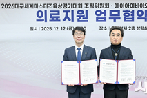 [시사뉴스 하정수 기자] 2026대구세계마스터즈육상경기대회 조직위원회(이하 조직위)는 12월 12일(금), 대구광역시청 동인청사에서 (사)AI 바이오·메디시티대구협의회(이하 협의회)와 대회 기간 의료 공동 대응 강화를 위한 업무협약을 체결했다. 이날 협약식에는 김정기 대구광역시장 권한대행 행정부시장 겸 조직위원장, 민복기 AI 바이오·메디시티대구협의회장, 진기훈 조직위 사무총장 등이 참석해, 대회의 안전한 경기 환경 조성과 신속한 의료 대응 체계 구축을 위해 상호 협력하기로 뜻을 모았다. 이번 협약에는 △의료실무협의회 구성 및 의료 비상대응계획 공동 추진 △대회 공식병원 및 후송병원 지정·운영 △의료 인력 지원 및 응급의료 차량 배치 협조 등 실질적인 협력 방안이 포함돼 있다. 이를 통해 협의회 소속 단체들이 보유한 전문 인력과 의료 자원을 적극 활용함으로써 대회 기간 중 체계적이고 신속한 의료지원이 가능할 것으로 기대된다. 세계마스터즈육상경기대회(WMAC)는 35세 이상의 생활체육인이 참가하는 대표적인 전 세계 규모의 육상경기대회로, 경쟁보다 교류와 화합을 중시하는 글로벌 스포츠 축제로 자리매김해 왔다. 26회째를 맞는 이번 대구대회는 2026년 8월 21