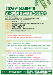 [시사뉴스 장시목 기자]청도군(군수 김하수)은 농촌 인구감소와 고령화로 인한 농번기 일손 부족 문제 해소를 위해 9월 17일부터 10월 17일까지 「2026년 상·하반기 외국인 계절근로자」 고용 희망농가 수요조사를 실시하고 있다. 이번 수요조사는 일손이 필요한 농업경영체에 등록된 농가, 영농법인 및 사업자등록증 상 농산물가공업에 등록된 가공 법인을 대상으로 하고 있으며, 농가의 농작업 일정에 맞추어 근로기간(5개월/8개월)과 입국시기(2월/9월/12월)를 선택하여 신청할 수 있다. 계절근로자를 고용하는 농가의 경우 최저임금(2025년 최저시급 10,320원)에 따른 급여를 지급하고 필수적으로 숙소를 제공하여야 하며, 신청을 희망하는 농가는 신청서, 신분증, 농업경영체 등록증 등 구비서류를 갖추어 각 읍·면사무소에 제출하면 된다. 외국인 계절근로자 프로그램은 해외 근로자를 초청하여 최대 8개월간 관내에 체류하며 농가에 일손을 지원하는 사업으로, 청도군은 올해 101농가에 356명을 배정받아 2023년 대비 약 4배 증가한 인력을 지원하고 있다. 또한 군은 필리핀 카빈티시, 산토토마스시, 라오스 노동사회복지부 등과 업무협약을 체결하여 안정적인 인력 공급망을 구축