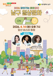 [시사뉴스 장시목 기자]대구 남구(구청장 조재구)는 지역 주민들에게 일상 속 문화 향유 기회를 확대하고, 지역 예술가들의 공연 활동을 지원하기 위해 ‘2026 찾아가는 문화공연’ 을 개최한다. 관내 신규 입주 공동주택을 대상으로 공연을 희망하는 아파트 단지를 선정하였으며, 오는 4월 14일(화) 앞산비스타동원 아파트에서 첫 공연을 진행할 예정이다. 저녁 7시에 열리는 ‘앞산비스타동원 음악회’에서는 인기 개그맨 김재롱이 사회를 맡고, 지역 가수 이새벽과 미스트롯 4 출연자 장혜리 가수가 공연을 펼친다. 또한, 아파트 입주 후 처음으로 열리는 주민 참여 행사인만큼 입주자 대표회에서도 다양한 경품과 선물을 준비하여 주민 화합의 장을 만들 예정이다. 조재구 남구청장은 “대규모 축제나 행사도 중요하지만, 주민들이 사는 가까운 동네에서 편하게 문화예술을 접할 수 있도록 찾아가는 문화행정을 적극 추진하겠다.”라며, “아파트로 찾아가는 음악회를 통해 주민들이 일상에서 소소한 행복을 느끼며 힐링할 수 있기를 바란다.”라고 전했다. ‘찾아가는 문화공연’에 대한 문의는 남구 문화관광과 문화예술팀(053-664-3264)으로 연락하면 안내받을 수 있다.