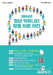[시사뉴스 이성동 기자] 대구 중구는 지역 청년들의 자발적인 모임과 창의적인 활동을 지원하기 위해 ‘2026년 청년 커뮤니티 활동 지원 사업’을 추진한다. 이번 사업은 청년들이 비용 부담 없이 프로젝트를 기획·실행할 수 있도록 활동비를 지원해 건강한 청년문화를 조성하고, 지속 가능한 청년 커뮤니티 기반을 마련하기 위해 추진된다. 지원 대상은 중구에서 활동 중인 4인 이상 청년 동아리로, 구성원 중 중구 거주자 또는 중구 내 학교·직장·사업장에 소속된 청년이 포함돼야 하며, 동아리 구성원 중 만 19세부터 39세까지의 청년 비율이 60% 이상이어야 한다. 선정된 팀에는 팀당 100만 원을 지원하며, 총 6개 팀을 선정할 예정이다. 지원 분야는 문화예술, 봉사활동, 자기개발·학습, 토론, 취업준비, 창업준비 등이며, 활동비는 재료비·강사료·임차료·모임비 등 커뮤니티 운영에 필요한 항목에 사용할 수 있다. 아울러 사업 기간 중 최소 3회 이상 정기 모임 활동을 해야 한다. 신청 기간은 4월 10일 오후 6시까지이며, 신청서와 활동계획서 등 구비서류를 원본 스캔해 담당자 이메일로 제출하면 된다. 자세한 신청 방법은 중구청 누리집 공고문에서 확인할 수 있다. 선정 결