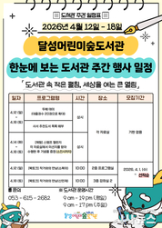 [시사뉴스 이성동 기자] 대구 달성어린이숲도서관이 ‘도서관 주간’을 맞아 개최한 독서문화 행사가 지역 어린이와 학부모들의 뜨거운 관심 속에 진행되고 있다. ‘도서관 속 작은 펼침, 세상을 여는 큰 열림’을 주제로 운영되는 행사는 오는 18일까지 이어진다. 행사의 포문은 지난 12일 ‘소복이 작가와의 만남’이 열었다. 이날 참여한 어린이와 부모들은 작가와 함께 그림책을 읽고 ‘네 컷 만화 그리기’를 통해 상상력을 나누는 뜻깊은 시간을 가졌다. 행사에 참여한 한 학부모는 “아이와 함께 감정을 공유하며 책과 한층 가까워진 기분”이라고 전했다. 열기는 오는 18일 오전 예정된 ‘급식실의 달평 씨’ 신민재 작가와의 만남으로 이어진다. 초등학생을 대상으로 하는 이번 강연에서는 작가의 생생한 창작 이야기와 함께 직접 그림으로 표현해보는 독서 체험이 준비되어 있어 또 한 번 어린이들의 발길을 끌 전망이다. 행사 기간 도서관 문턱은 더욱 낮아진다. 대출 권수를 20권까지 대폭 확대하며, 도서관 곳곳을 누비는 스탬프 챌린지 등 시민들의 발길을 붙잡는 참여형 이벤트가 상시 운영된다. 최재훈 달성군수는 “이번 도서관주간 행사를 통해 어린이와 가족들이 책과 더욱 가까워지고, 도서관