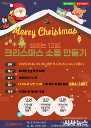 [시사뉴스 장시목 기자]대구 남구(구청장 조재구)는 꿈틀작은도서관에서 12월 한 달 동안 어린이를 위한 다양한 체험프로그램으로 크리스마스 특강을 운영한다고 밝혔다. 크리스마스 특강은 초등학생을 대상으로 12월 6일부터 20일까지 매주 토요일 오후 2시에서 4시까지 총 3회 진행될 예정으로 크리스마스와 연말 분위기를 흠뻑 느낄 수 있도록 구성되었다. ‘설레는 12월, 크리스마스 소품 만들기’라는 주제로 12월 6일에는 ‘크리스마스 유리볼 만들기’, 12월 13일 ‘커피박으로 친환경 키링 만들기’, 12월 20일 ‘크리스마스 트리 만들기’ 등 다양한 체험을 할 수 있도록 준비했다. 참여 신청은 11월 25일(화) 오전 10시부터 전화(☎664-3557) 또는 꿈틀작은도서관을 방문하여 접수할 수 있으며, 자세한 내용은 대명어울림도서관 홈페이지에서 확인할 수 있다. 조재구 남구청장은 “작은도서관에서 마련한 프로그램과 함께 따뜻한 연말을 보내시기 바란다.”라며, “내년에도 지역 주민들을 위해 더욱 알찬 프로그램을 운영하도록 노력하겠다.”라고 전했다.